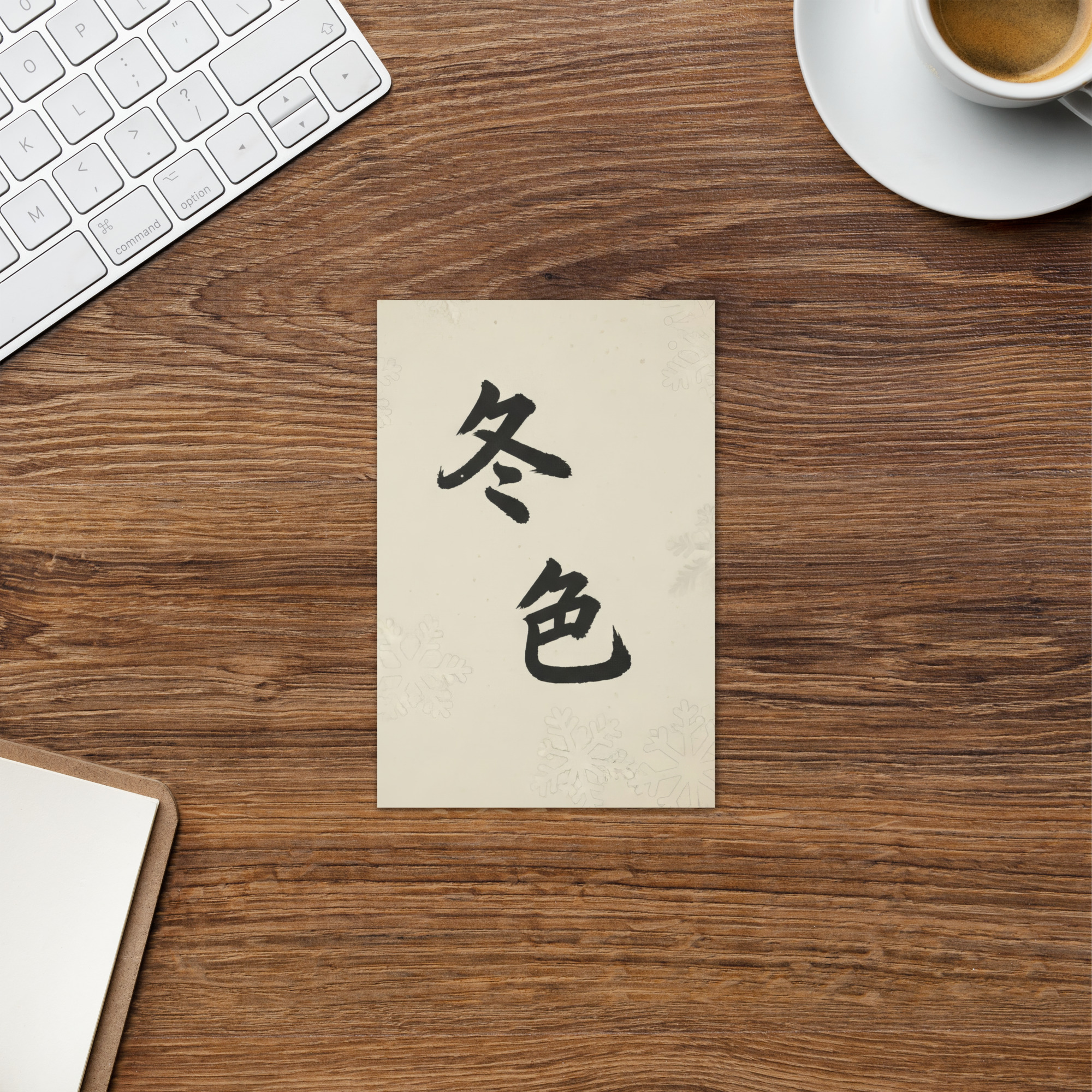Bold black calligraphy on a soft white background, with subtle snowflake patterns, forms the elegant design of this card from the Zen Library Winter Scenes series. The two characters – 冬色 (dōng sè) – translate to “winter colours” or “winter scenery,” evoking the stillness, clarity, and quiet beauty of the season.